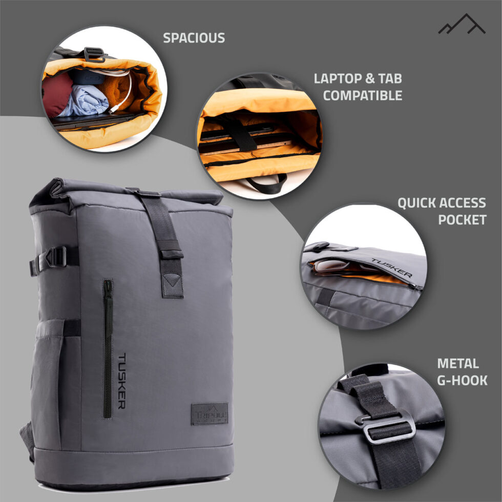 The Tusker is the new-age multi-utility laptop backpack for not just casual or office usage but also for multi day trips. Smartly built for the modern minimalist in you, the roll top design is a quick tag and release mechanism through a metal G hook on the top. The spacious inner can hold your laptop and tab securely while leaving loads of space for daily use accessories or packing in some clothes for a couple of days. The expandable rolling top allows you to adjust the height of the bag according to the utility. Comfortable shoulder pads, multiple pockets for accessories, trolley access strap add to the utilities and makes it the perfect modern backpack for all sorts of usage. About seller – Tripole Gears is also the original manufacturer of this backpack which enables us to provide better support and service on our products.